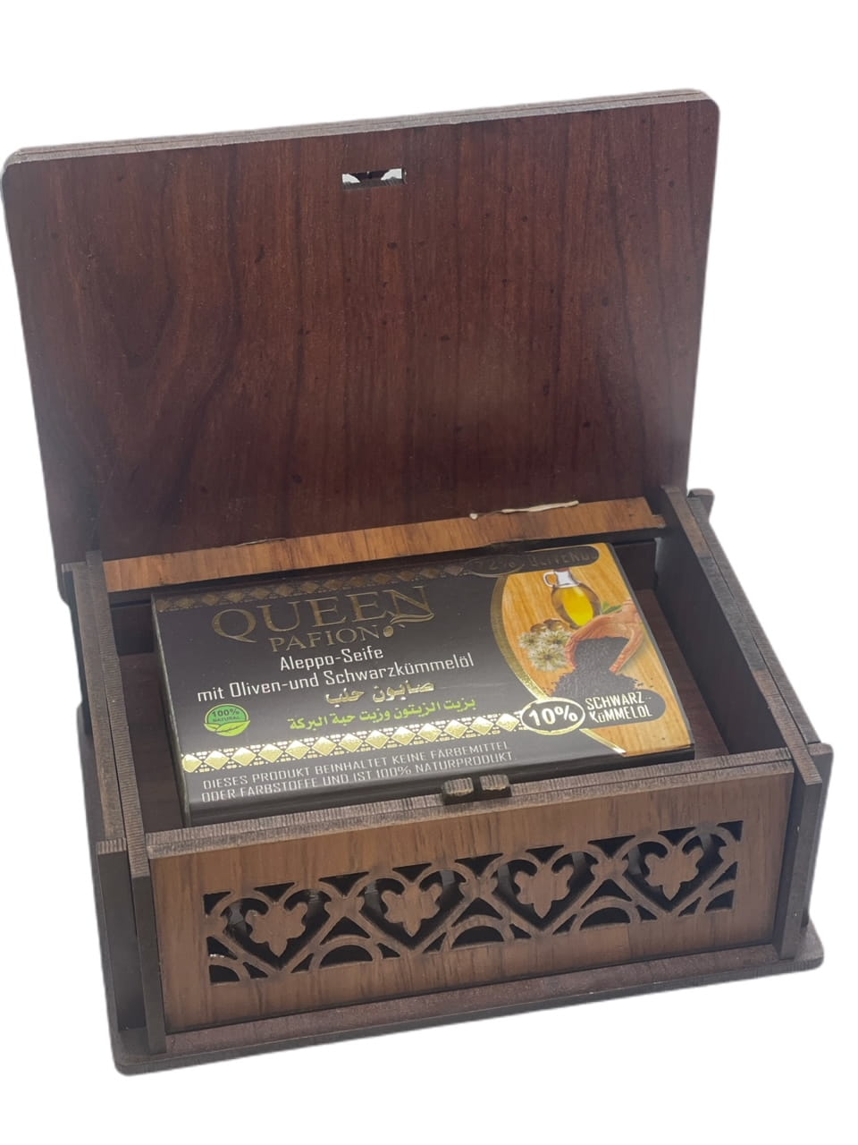 MYDEŁ ALEPPO PREMIUM 10% OLEJU Z CZARNUSZKI W OZDOBNYM PUDEŁKU QUEEN PAFION 150g